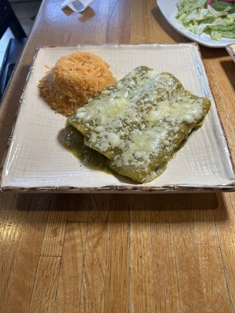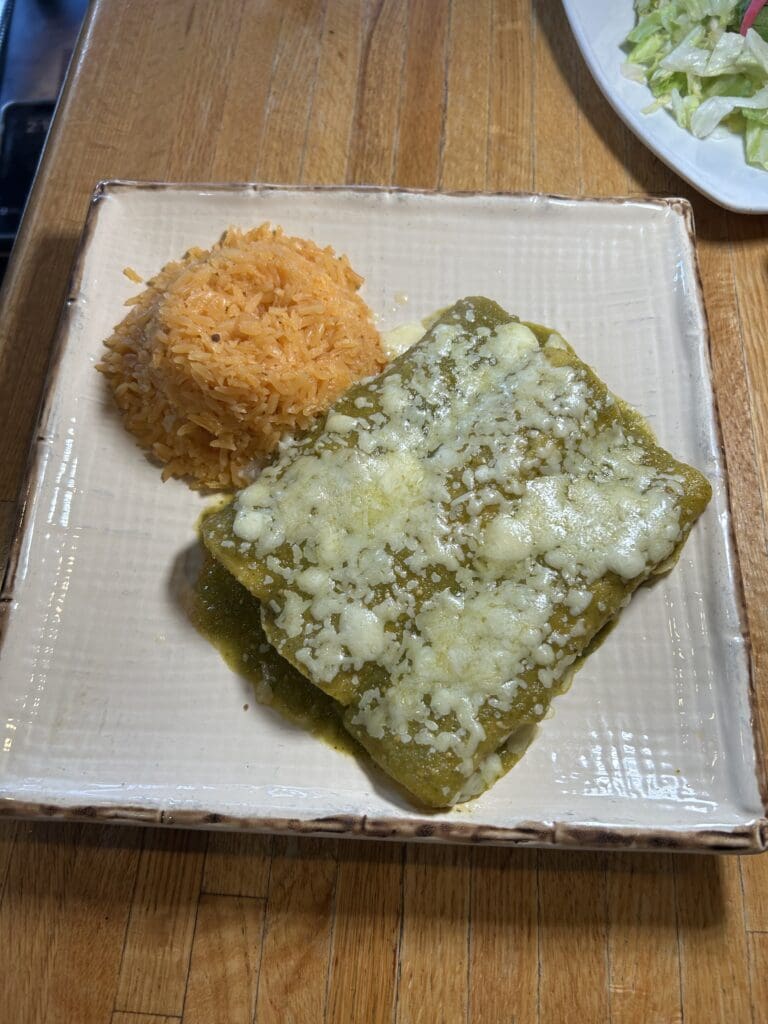 Enchiladas Verdes – three stuffed enchiladas filled with shred beef and topped with a tangy tomatillo sauce – what could be better?