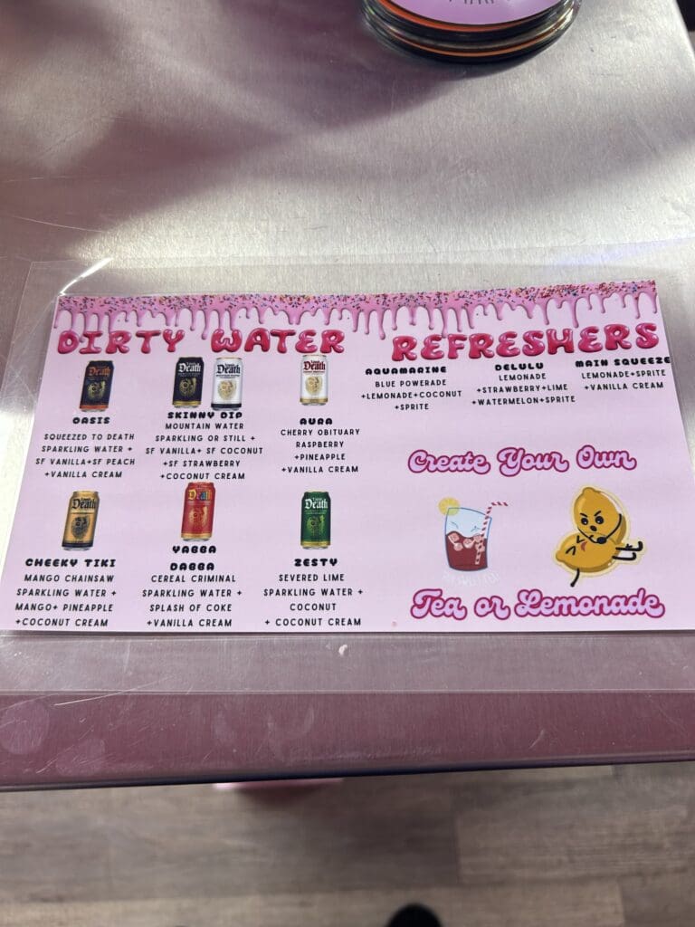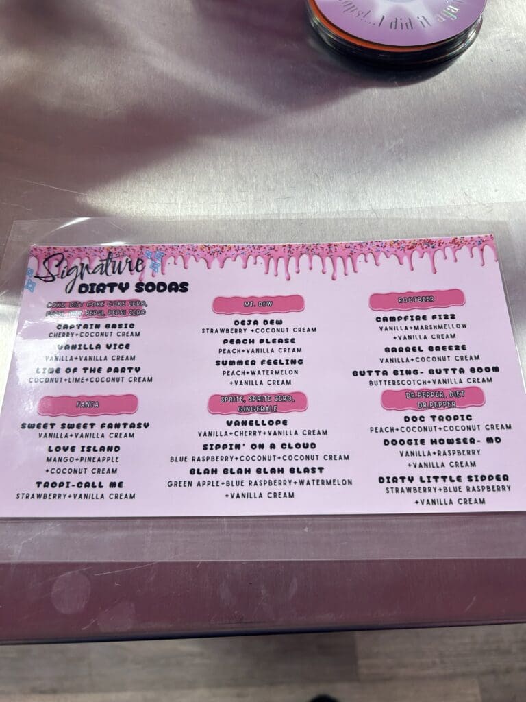 There aren’t a ton of comparisons in our area for price for dirty sodas, but compared to the handful of options in the area, they have standard pricing. Most of the sodas are around $5 or $6, while the Alanis are around $7. The waters are also between $5 and $6, and they even have kid’s drinks for under $5. All in all, an affordable way to try something new.
