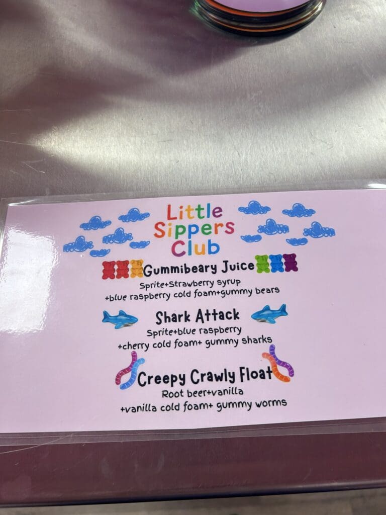 Shark Attack – lastly, we tried one of the kid’s drinks. This one is so fun, with Sprite, blueberry syrup, and cherry cold foam. It is even topped with a gummy shark. Kids go nuts for this drink.