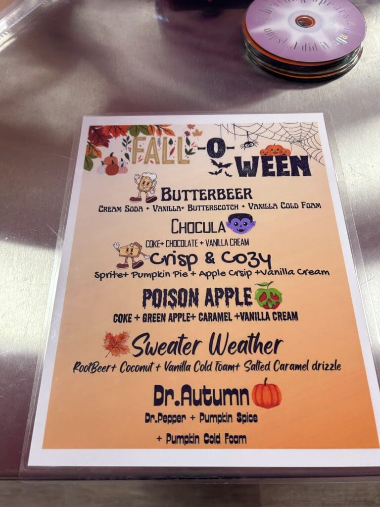 Campfire Fizz – this is the perfect Fall drink, with Rootbeer, Vanilla and marshmallow syrup, and Vanilla cold foam. This tasted like a Fall night around the bonfire.