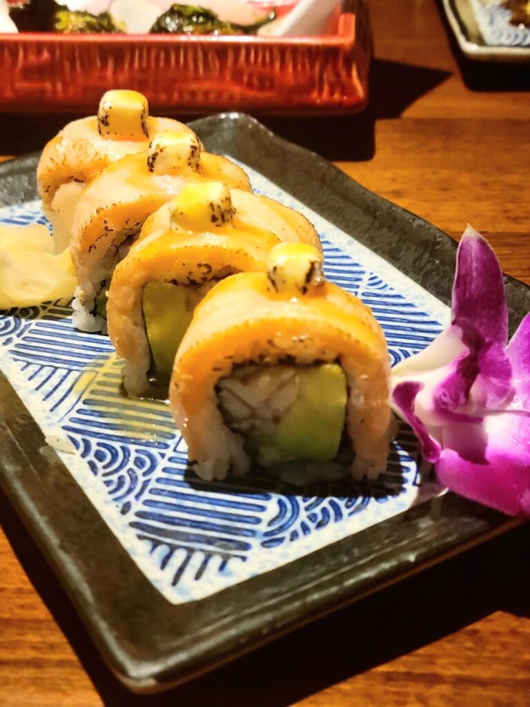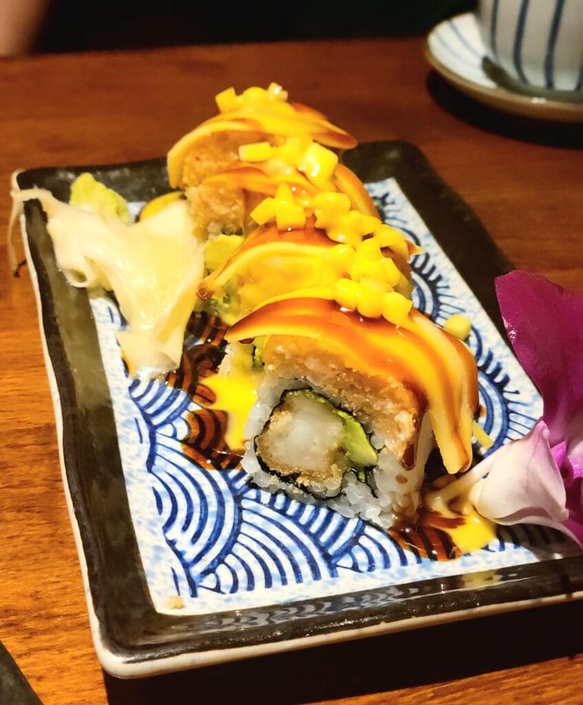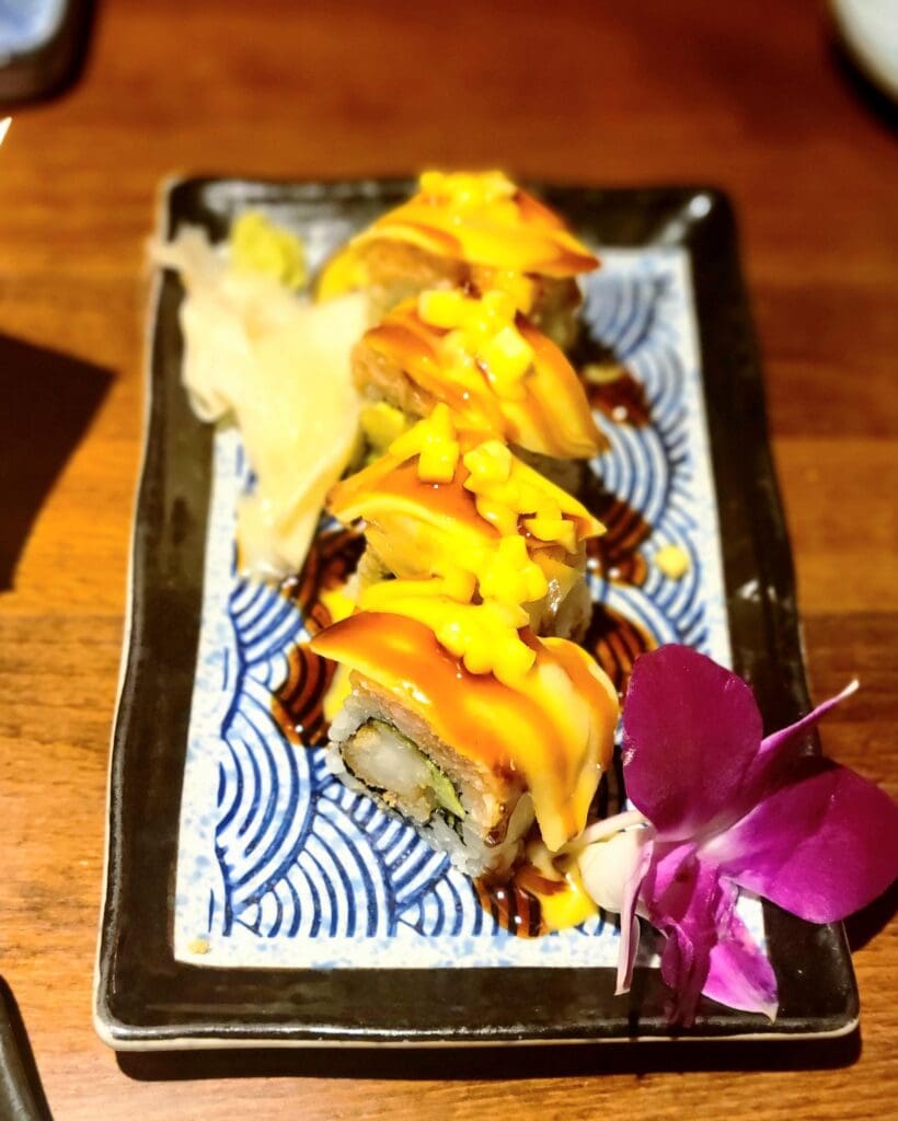 This included shrimp tempura and avocado inside, topped with lobster salad and mango with eel and mango sauce.